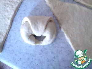 Используйте любимый способ формовки рогаликов или даже несколько, как я. Не забудьте хорошо защипнуть начинку, чтобы она не вытекла во время выпекания.