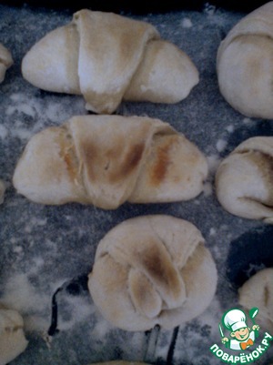 Выпекайте рогалики в духовке до зарумянивания. При желании можно смазать верх яйцом, сметаной, молоком или чайной заваркой. Я решила оставить их в "первозданном" виде, чуть припыленными мукой.
