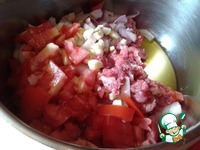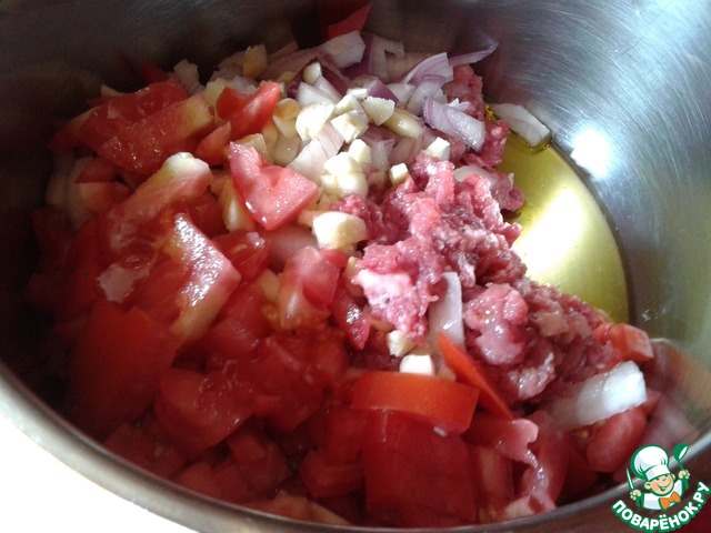 В кастрюлю наливаем масло оливковое, выкладываем фарш, добавляем лук, чеснок и помидоры, порезанные кубиками. Пассеруем на медленном огне. |