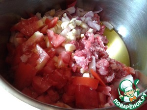В кастрюлю наливаем масло оливковое, выкладываем фарш, добавляем лук, чеснок и помидоры, порезанные кубиками. Пассеруем на медленном огне.