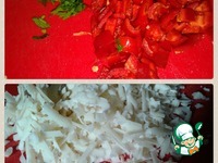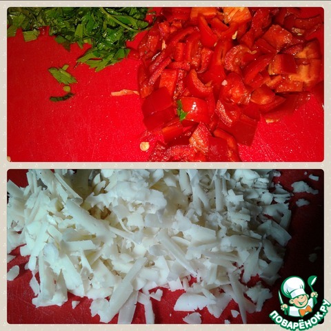 Добавляем томатный сок, болгарский перец. Специи, конечно, протушиваем до готовности ингредиентов и выпаривания лишней жидкости. В полуостывший фарш добавляем сыр. |