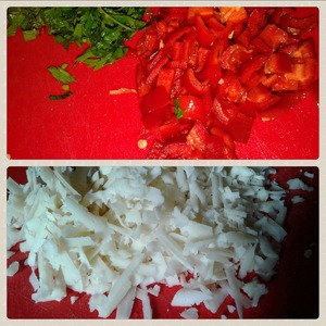Добавляем томатный сок, болгарский перец. Специи, конечно, протушиваем до готовности ингредиентов и выпаривания лишней жидкости. В полуостывший фарш добавляем сыр.