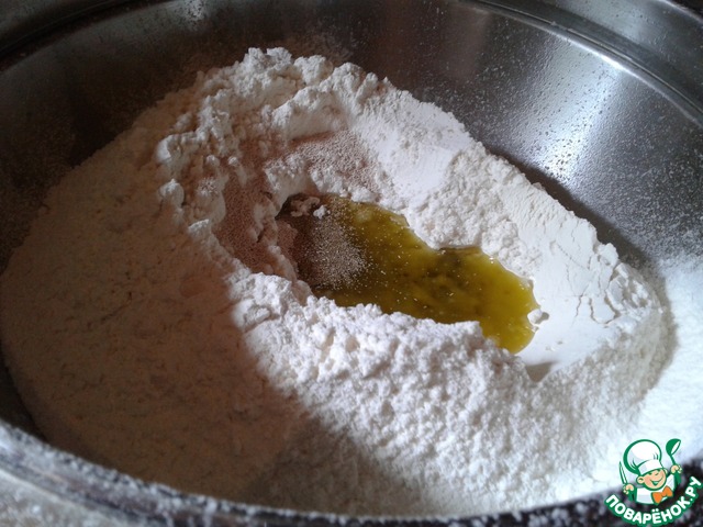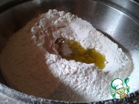 Просеять муку, влить масло, добавить соль и немного дрожжей. Вливая постепенно воду, замесить эластичное тесто, не клеящееся к руками. |