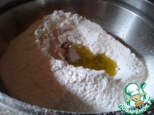 Просеять муку, влить масло, добавить соль и немного дрожжей. Вливая постепенно воду, замесить эластичное тесто, не клеящееся к руками.
