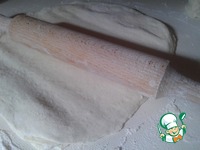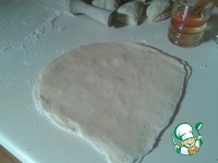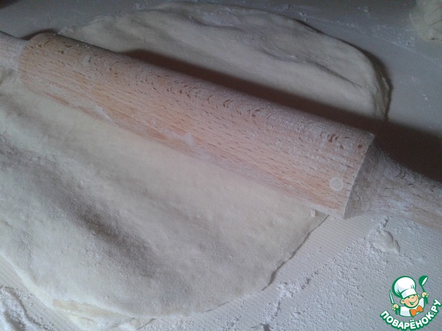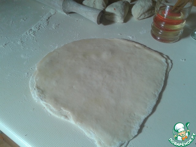 Тесто делим пополам, а затем каждую половину на 4-6 частей. Из первых 4- 6 частей раскатываем небольшие лепешки, смазываем обильно маслом и укладываем стопочкой друг на друга. Последнюю лепешку не смазываем. |