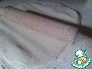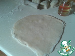 Тесто делим пополам, а затем каждую половину на 4-6 частей. Из первых 4- 6 частей раскатываем небольшие лепешки, смазываем обильно маслом и укладываем стопочкой друг на друга. Последнюю лепешку не смазываем.