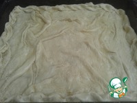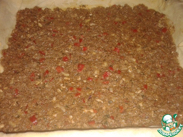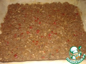 Фило выкладываем в противень, застилая бортики. Сверху выкладываем фарш. |