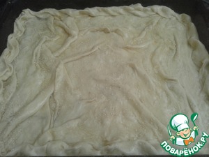 Фило выкладываем в противень, застилая бортики. Сверху выкладываем фарш.