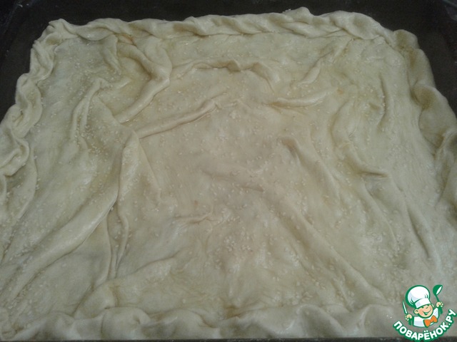 Из оставшихся кусочков теста по описанной выше методике раскатываем тесто и произвольно (как ляжет)укладываем сверху фарша. Бортики закручиваем внутрь. При желании сверху посыпьте кунжутом.