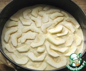 Я предпочитаю такой дизайн. Выливаю все тесто в форму и втыкаю яблочные ломтики вертикально. Оставляем пирог при комнатной температуре на 4 часа. Совершенно не надо создавать ему более теплые условия, чем 20-22 градуса.