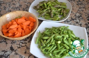 3. Тем временем зеленую фасоль помыть и нарезать. Морковь очистить и нарезать равными кусочками. У спаржи отломать жесткие черенки и нарезать.