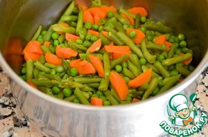 4. В большой кастрюле вскипятить воду и добавить морковь, накрыть и варить 5 минут. Всыпать фасоль, спаржу и горошек, накрыть и готовить еще 5 минут, или пока овощи не станут мягкими.