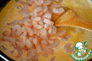5. Растопить масло для соуса в сотейнике с толстым дном. Всыпать муку и готовить, помешивая, 2 минуты. Снять с огня, добавить сливки, бульон и размешать, вернуть на огонь и готовить, помешивая, до загустения соуса. Приправить солью и перцем по вкусу, добавить тертый мускатный орех и сладкую паприку. Выложить в соус креветки и прогреть на медленном огне 2-3 минуты.