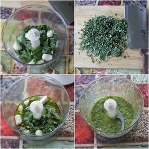 Стебли крупно порубить и положить в блендер вместе с очищенными дольками чеснока. Добавить оливковое масло и взбить все до однородности. -