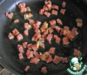 Немного оливкового масла разогреть на сковороде, мясо нарезать небольшими кубиками и потушить пару минут, помешивая.