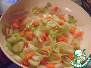 • Лук, морковь, сельдерей и порей нарезать небольшими кусочками, обжарить на сильном огне, помешивая, 2–3 минуты.