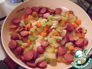 • Охотничьи колбаски нарезать кружочками, добавить к овощам, обжарить ещё 2 минуты.