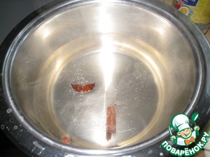 В горячей воде (500 мл) растворяем сахар, добавляем звездочку аниса и половину палочки корицы, доводим до кипения.