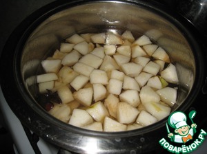 Добавляем нарезанные яблоки и груши, варим 7 минут, добавляем сливу, варим 3 минуты...