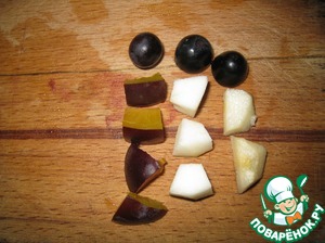 Яблоки, сливы и груши нарезать мелко – по размеру самой маленькой виноградины. Желатин замочить в 100 мл воды.