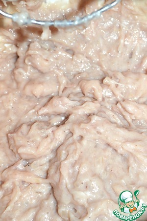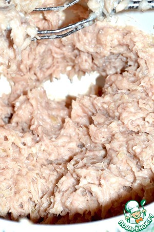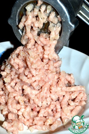 Два раза пропустить через мясорубку свинину, куриное филе и лук.