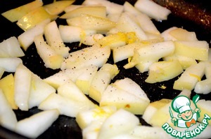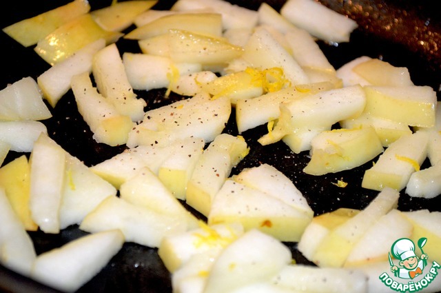 Яблоко вымыть и удалить сердцевину, нарезать на небольшие кусочки. В сковороде растопить сливочное масло и обжаривать 5 минут на нем яблоко полив его лимонным соком. Добавить половину цедры и черный свежемолотый перец. Яблоки остудить до комнатной температуры.