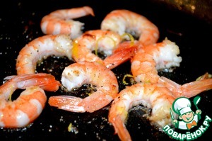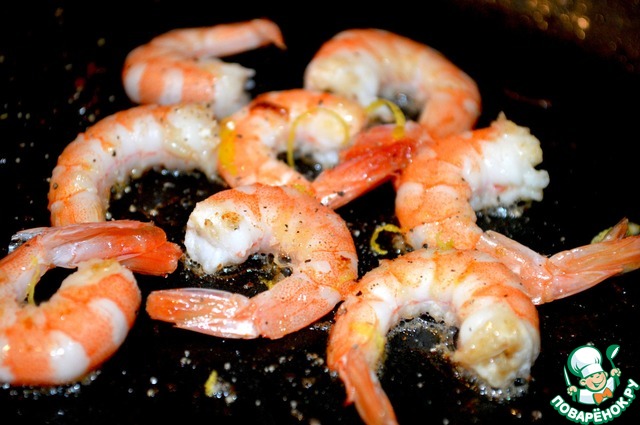 В сковороду налить оливковое масло и обжарить на нем креветки, добавить оставшуюся цедру, посолить и поперчить по вкусу. Вынуть и остудить до комнатной температуры.