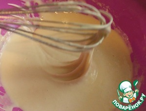 Яйца сбить с щепоткой соли. К яйцам добавить молоко и растопленное сливочное масло, взбить. Муку просеять с разрыхлителем и понемногу добавлять к полученной смеси. Замесить жидкое тесто (как на блины).