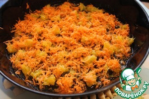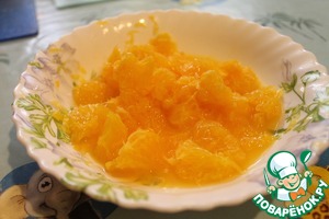 Подготовить начинку - апельсин очистить не только от кожуры, но и от пленочек, аккуратно порезать на небольшие кусочки (очищать от пленочек нужно над тарелкой, т. к. течет сок, который тоже пойдет в начинку). Морковь потереть на средней терке.