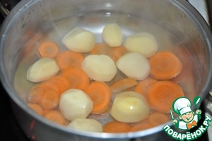 Бульон или воду доводим до кипения и варим в нём морковь и картофель 5 минут.