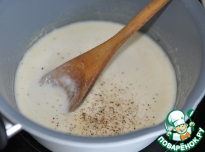 Добавляем сливки и увариваем соус на медленном огне. Добавляем соль и чёрный молотый перец.