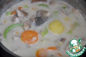 Кладём в соус овощи, грибы и рыбу и готовим на медленном огне 10 минут.