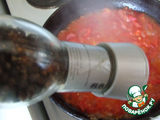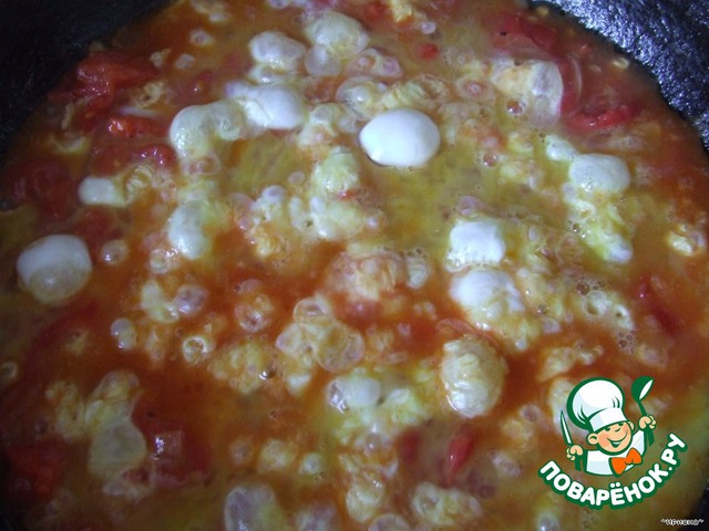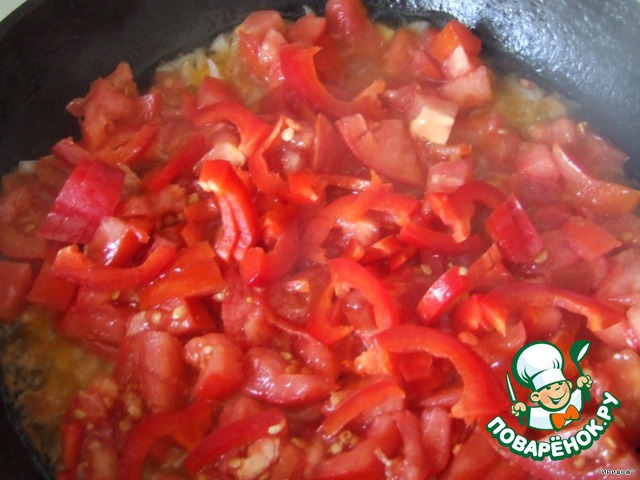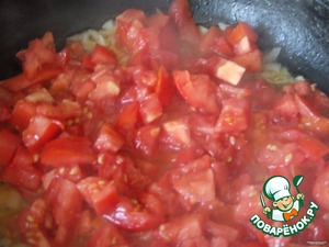 • В сковородку с луком добавляем порезанные кубиками помидоры. Тушить примерно 5 минут.