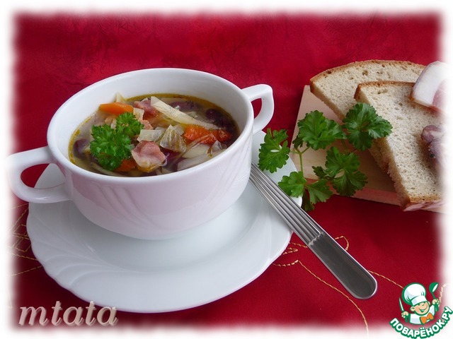 - Это этакий легкий вариант щей, пригламуренные. Картошку заменили на бобы. Нежные ароматы петрушки, чеснока и привкус копченого бекона. Тимьян Джейми сует везде, здесь указанное количество не сыграло роли в карусели вкусов. Просто это его фишка или сушеного надо больше.