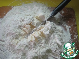 Ножом начинаем измельчать масло в муке, время от времени как бы заворачивая его в середину. Получаем мучную крошку.