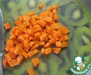 Подготовим тыкву. Очищаем от кожуры, вынимаем семечки, нарезаем мелким кубиком. -