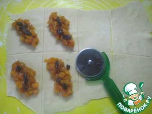 В серединку квадратика по диагонали выкладываем тыквенную начинку, кладем 2-3 изюминки.