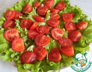 На тарелку выложить салатные листья (естественно перед этим их помыть и немного обсушить). Можно вместо салата использовать листочки зеленого базилика. А можно зелень вообще не использовать. Все по-желанию.