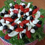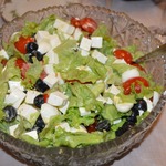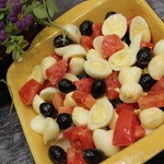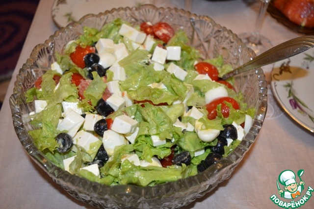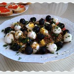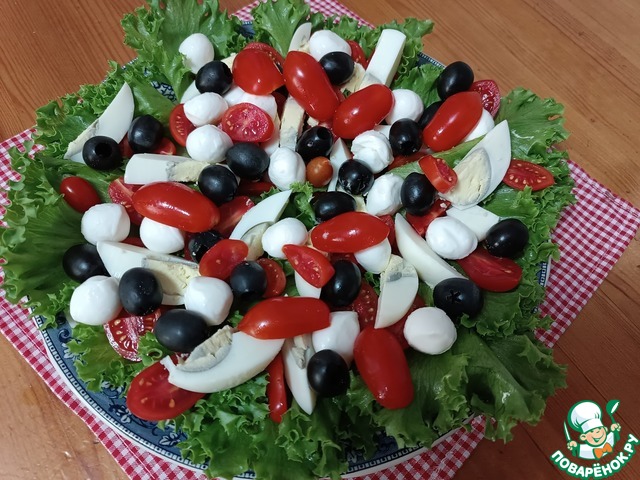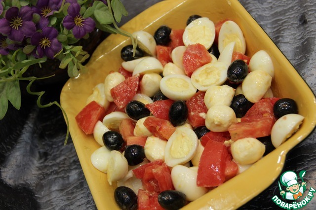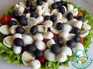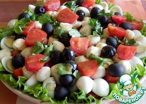 Далее в салат следуют маленькие шарики моцареллы и маслины.