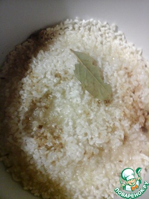 • Положить в масло полкило промытого, но не замоченного риса, кардамон и лавровый лист. Жарить рис до прозрачности.