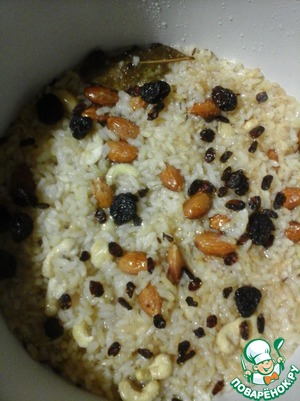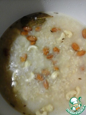 • Залить водой на палец над уровнем риса, варить на медленном огне под крышкой 5 минут. Добавить орехи.