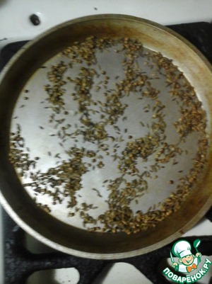 • На сухой сковородке поджарить зиру и кориандр.