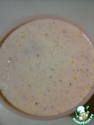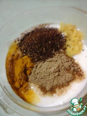 • В кефир добавить зиру с кориандром, кардамон, карри и имбирь. Хорошо перемешать.