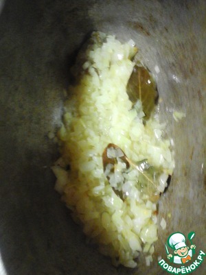 • В сотейнике раскалить растительное масло. Положить туда гвоздику, лавровый лист, мелко нарезанный лук и жарить до мягкости лука.