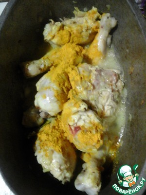 • Добавить курицу, протушить под крышкой, через 5 минут добавить куркуму, снова накрыть крышкой и тушить еще 20-30 минут.