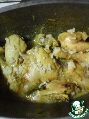• Выдавить на курицу чеснок, посолить, перемешать, накрыть крышкой и выключить огонь.