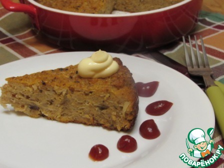 В форму, смазанную маслом, выложить заготовку и разровнять. У меня керамическая форма размером 20х21см, если используете металлическую, то наверное лучше еще присыпать панировочными сухарями. Отправить в разогретую духовку и запекать при 200 градусах 20-25 минут, ориентируйтесь на вашу духовку.