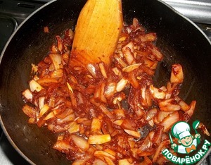 Лук нарезать произвольно. В маленькой сковороде разогреть масло, слегка обжарить лук, добавить томатную пасту (не кислую), пожарить постоянно помешивая минуты 3.