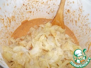 Добавить соль, не забывая, что капуста тоже немного соленая, и специи по вкусу (я добавила молотый розмарин, эстрагон и чесночный порошок), 3-4 ст. л. муки, хорошо перемешать венчиком. Тесто жидкое, муку можно взять и пшеничную, на вкус это не повлияет, но мне кажется, что с кукурузной получается нежнее. Ввести тушеную капусту и тщательно перемешать, чтобы каждый ломтик покрылся тестом.