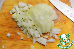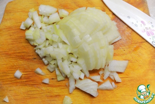 Лук нарезать мелкими кубиками и слегка обжарить в масле, в котором жарились сердечки.
